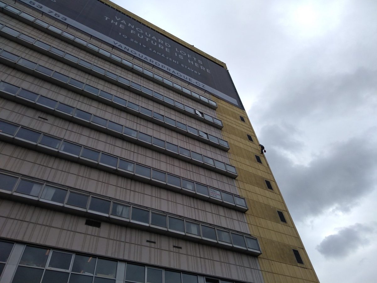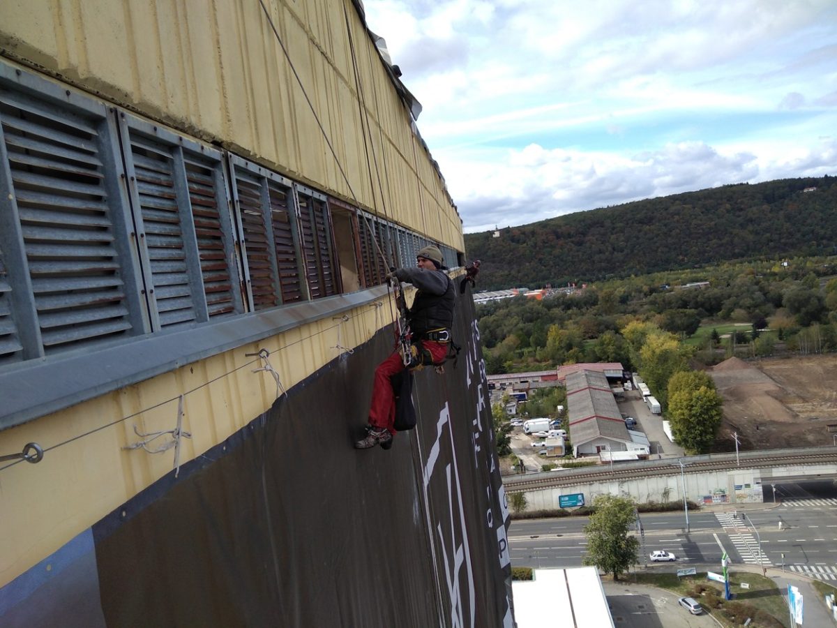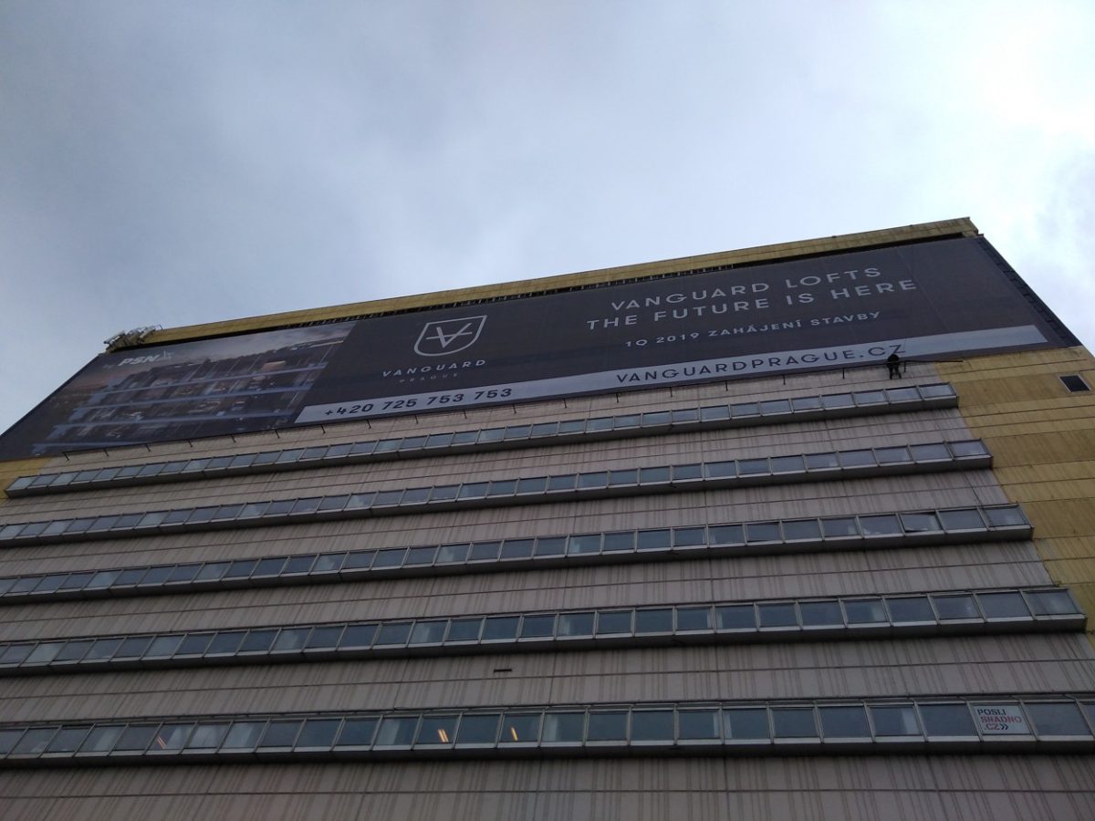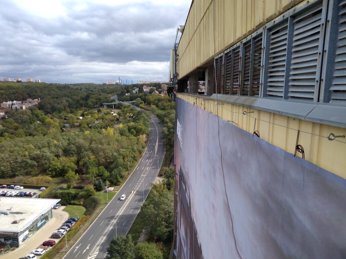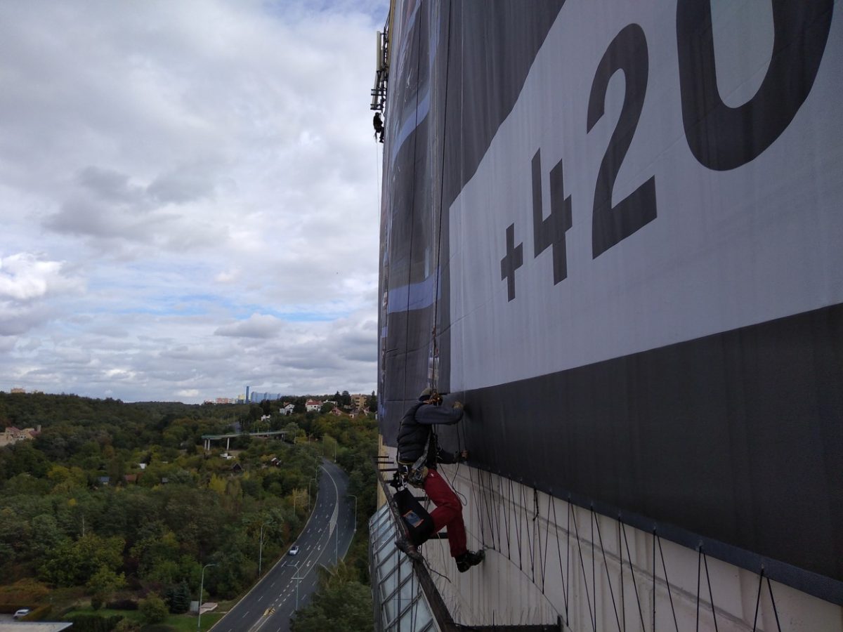 Firmou Skajp Invest jsme byli povoláni jako výpomoc při montáži reklamního banneru o neskutečném rozměru téměř 1000m2. Největším oříškem bylo dostat 400kg vážící plachtu na střechu, poté už to bylo jen o trpělivosti při vyplétání gumolanem. Tato reklamní plachta na Vás bude shlížet z výšky skoro 60ti metrů v pražských Modřanech.
