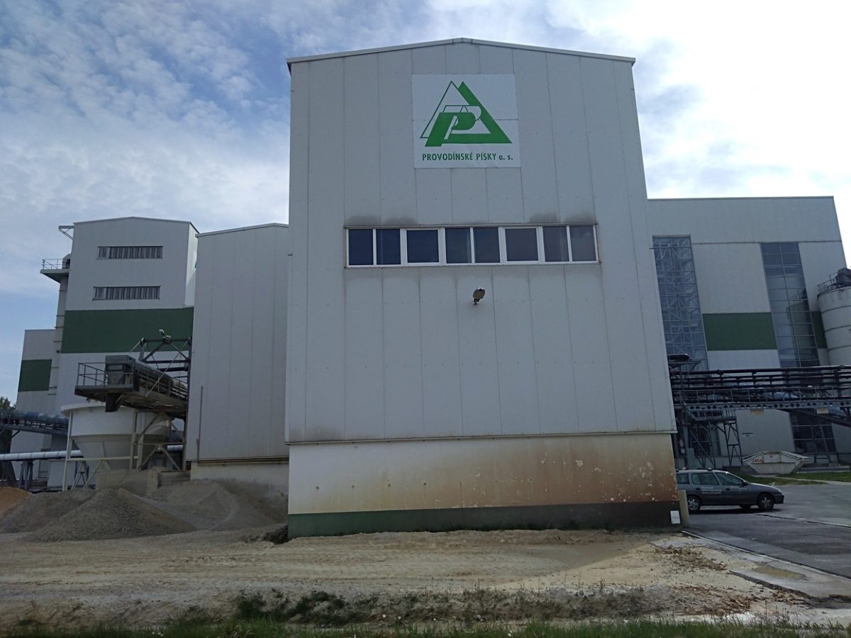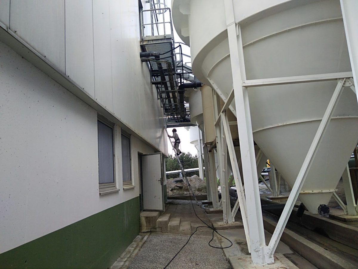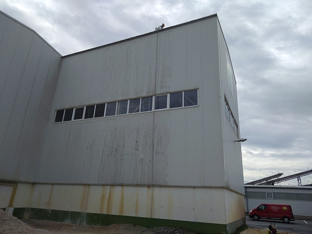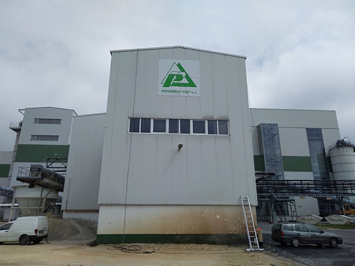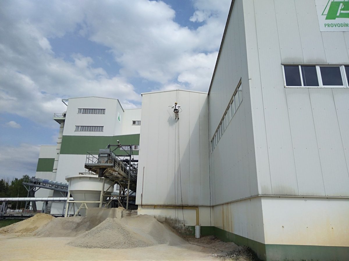 Od provozovatelů pískovny jsme dostali zakázku na umytí objektu úpravny písků. Celá plocha fasády byla silně znečištěna řasami a plísněmi, které bylo potřeba odstranit kvůli návštěvě zahraničního vedení firmy. Práce probíhaly dle podmínek buď horolezeckou technikou nebo ze žebříku. Pouze několik málo metrů bylo možno omýt z lávky.