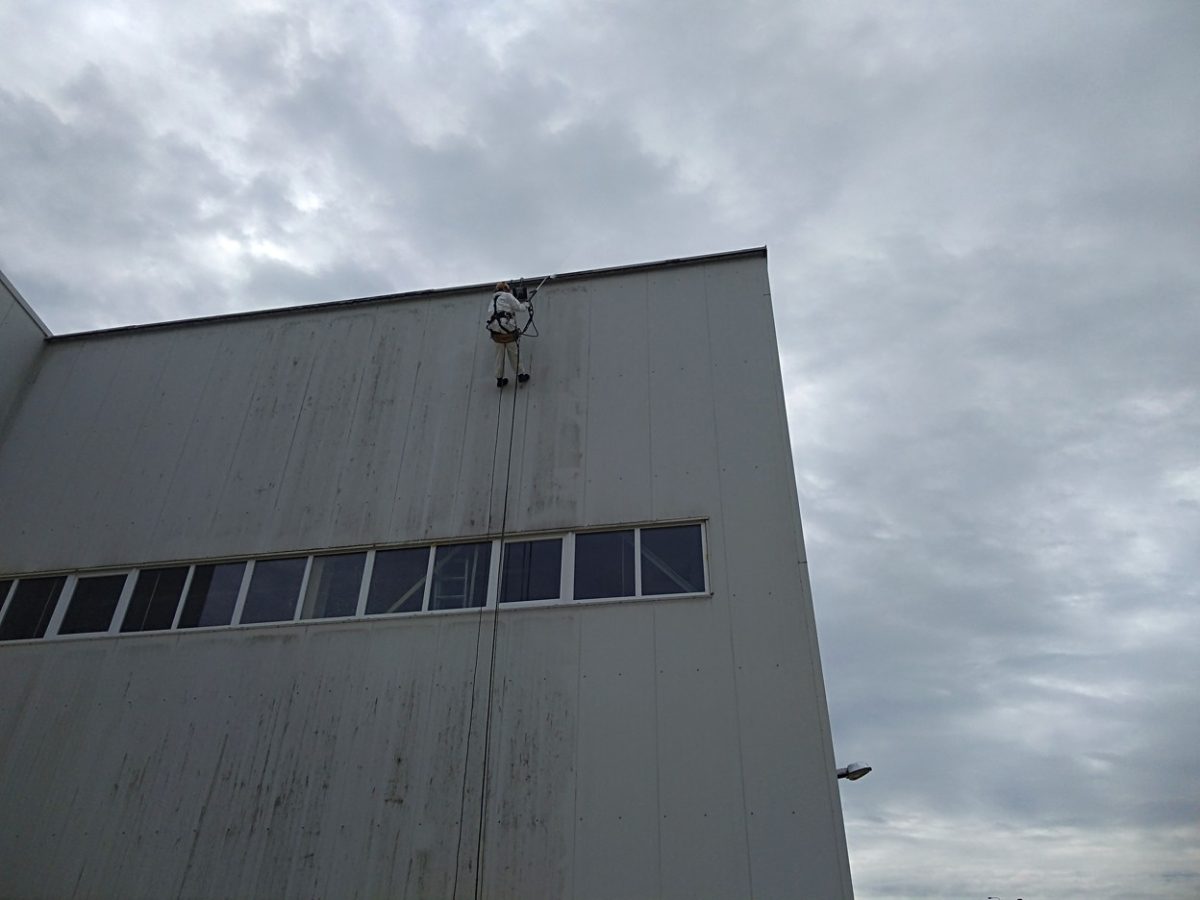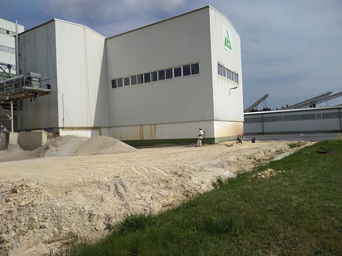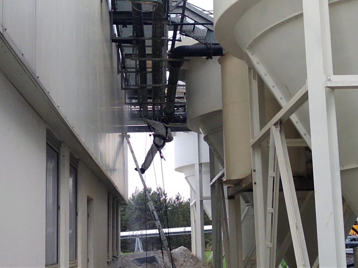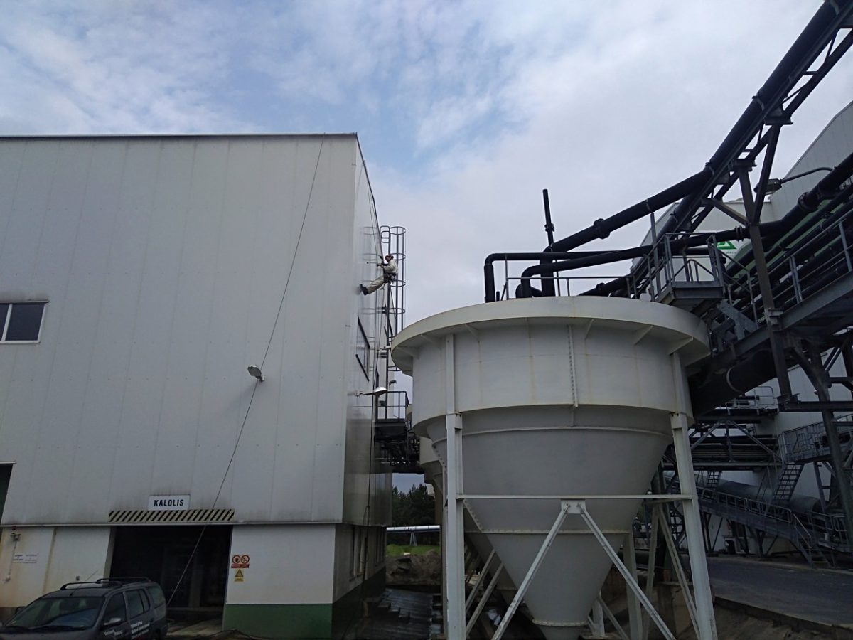 Od provozovatelů pískovny jsme dostali zakázku na umytí objektu úpravny písků. Celá plocha fasády byla silně znečištěna řasami a plísněmi, které bylo potřeba odstranit kvůli návštěvě zahraničního vedení firmy. Práce probíhaly dle podmínek buď horolezeckou technikou nebo ze žebříku. Pouze několik málo metrů bylo možno omýt z lávky.