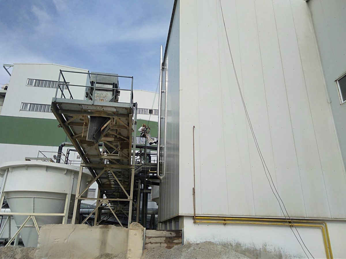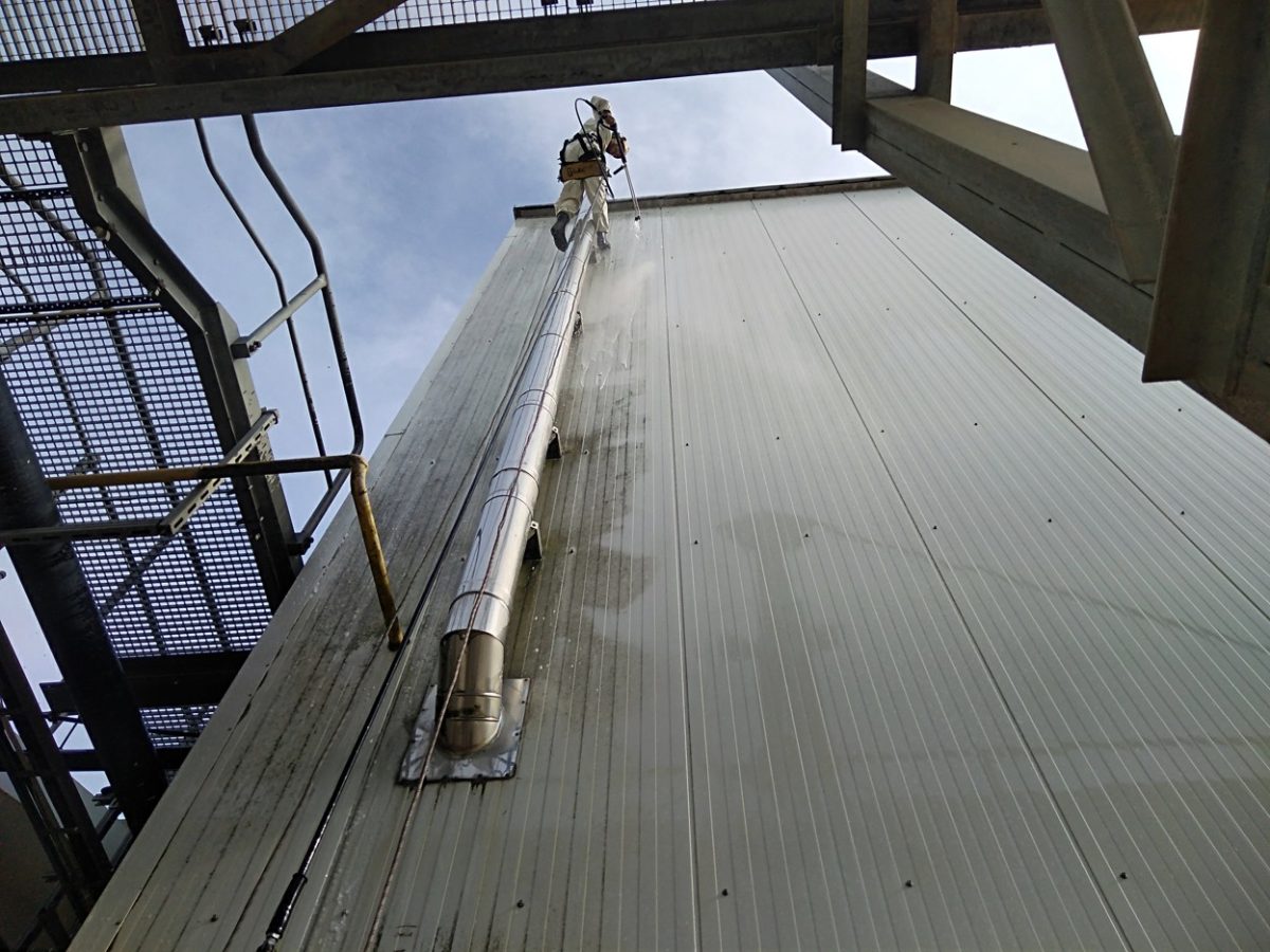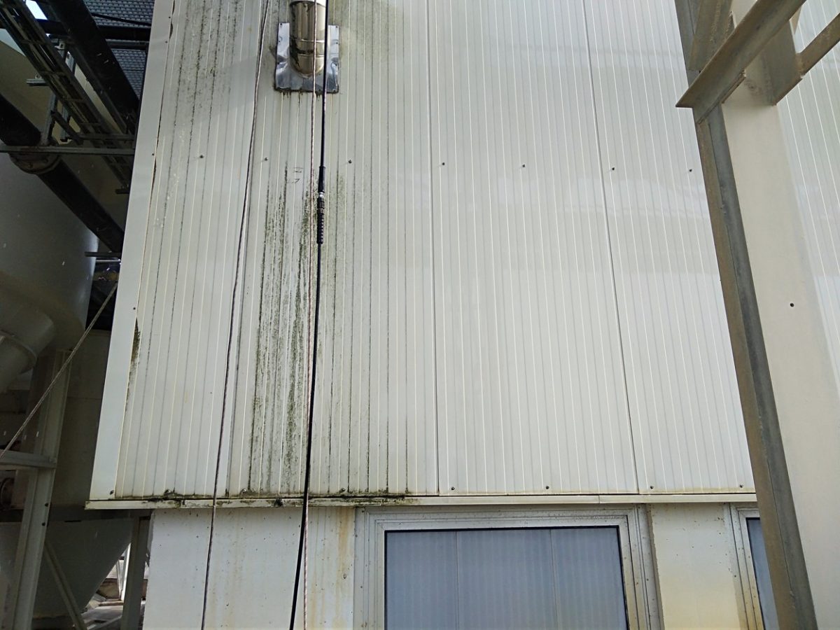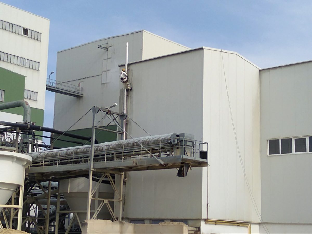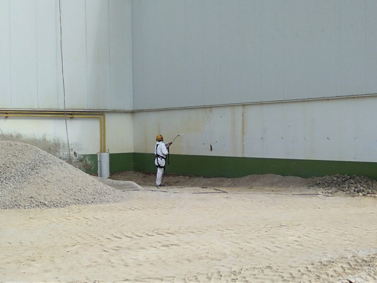 Od provozovatelů pískovny jsme dostali zakázku na umytí objektu úpravny písků. Celá plocha fasády byla silně znečištěna řasami a plísněmi, které bylo potřeba odstranit kvůli návštěvě zahraničního vedení firmy. Práce probíhaly dle podmínek buď horolezeckou technikou nebo ze žebříku. Pouze několik málo metrů bylo možno omýt z lávky.