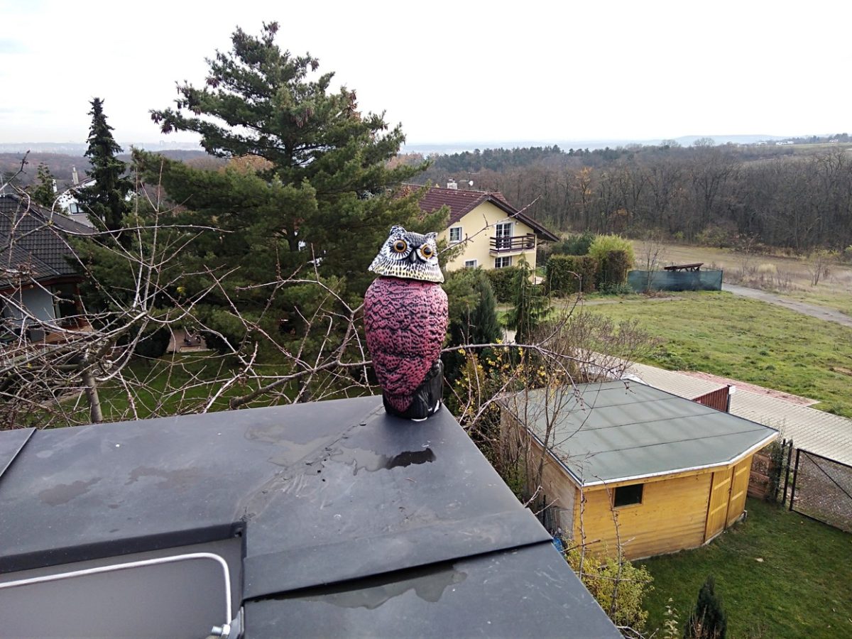 Poškození fasády datlovitými ptáky je v poslední době již tak běžné, že k němu vyjíždíme v závislosti na ročním období i několikrát za měsíc. Ani tentokrát se nejednalo o výjimku. Tři opravené díry jsme ještě doplnili maketou sýčka, kterou si zakoupil majitel domu.
