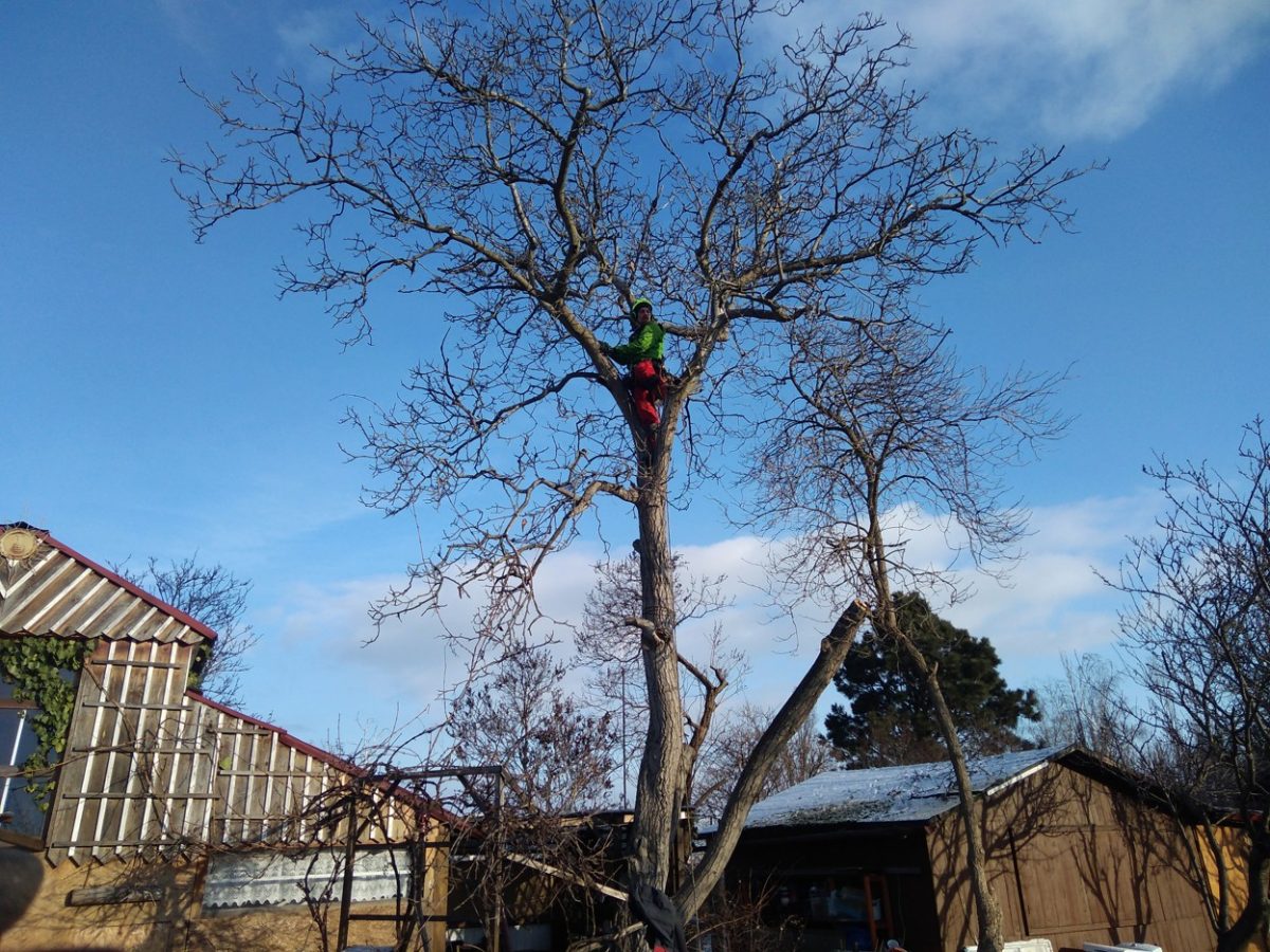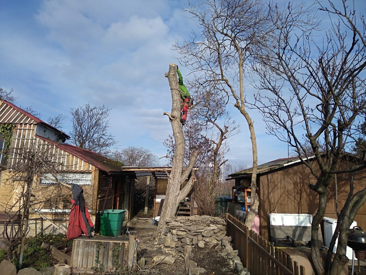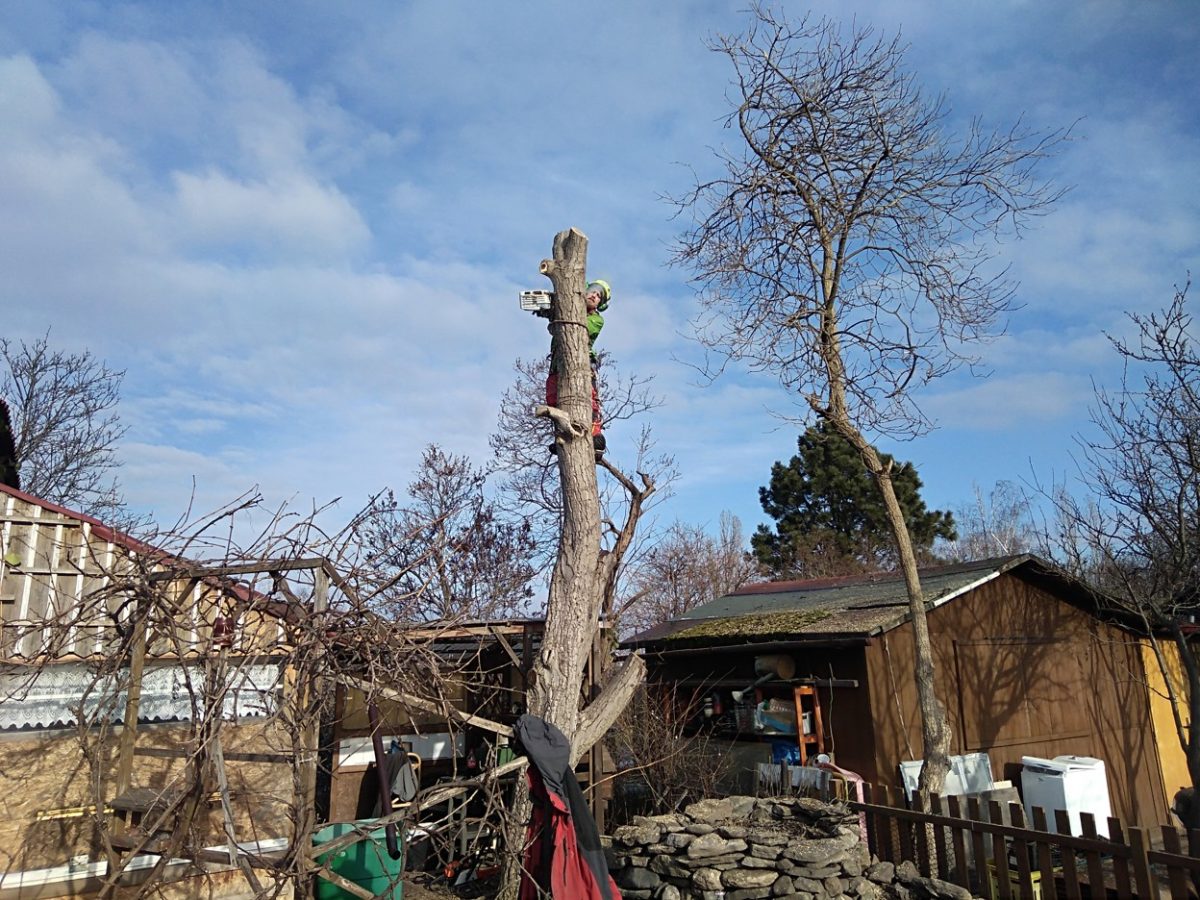 K pokácení dalšího ořešáku jsme byli pozváni do zahrádkářeké kolonie na pražském Balkáně. Místa pro kácení bylo opravdu málo. Z jedné strany chatka, z druhé plot, těsně u kmene vyvýšený záhon z vyskládaných kamenů. Jako zatím vždy se nám vše podařilo beze škod. Součástí zakázky byla i likvidace biomasy vzniklé kácením. Tu jsme odnosili do přistaveného kontejneru.