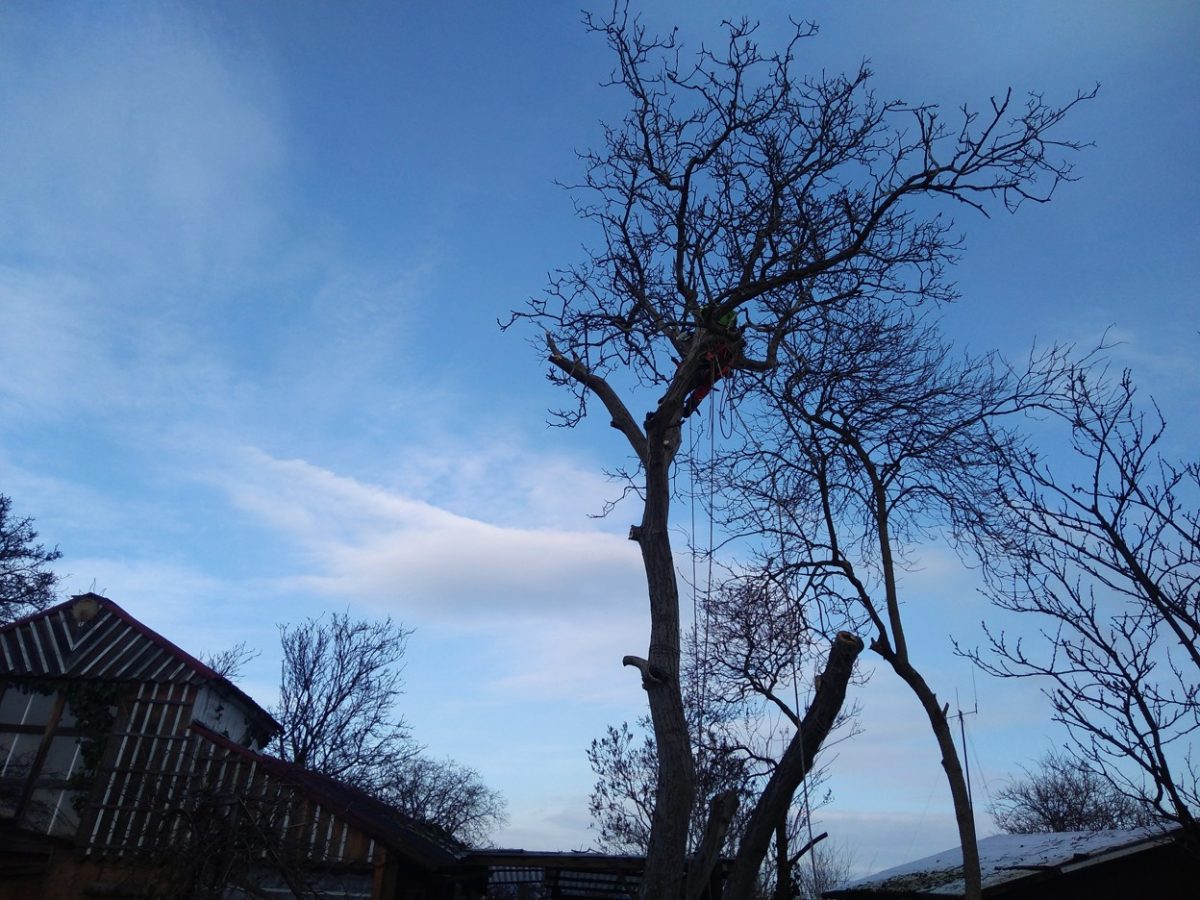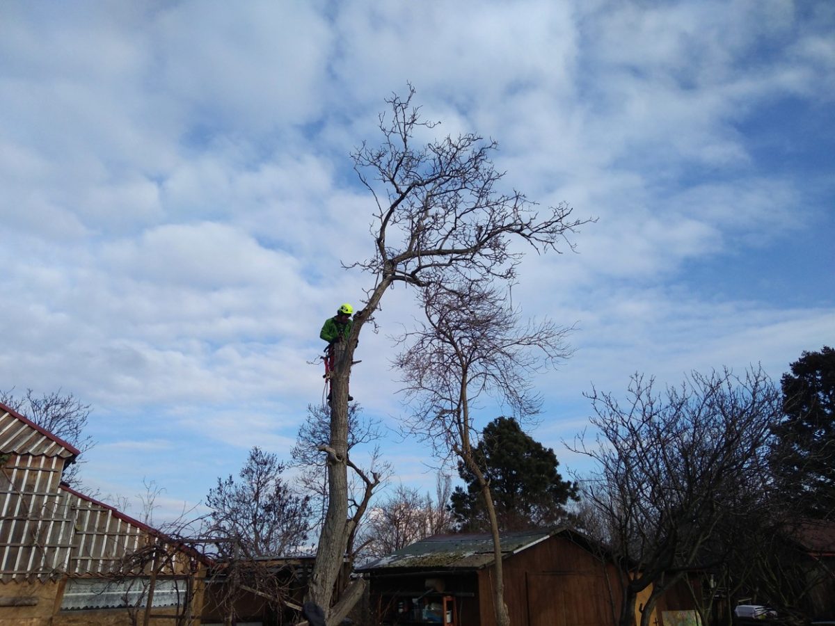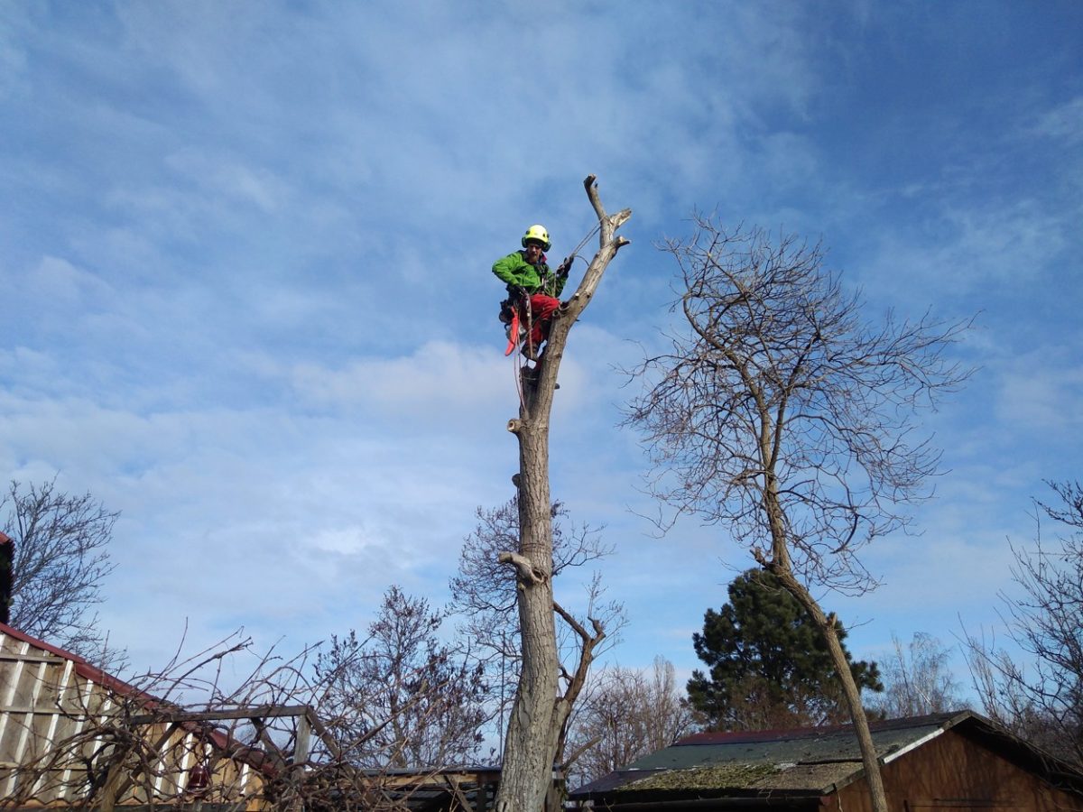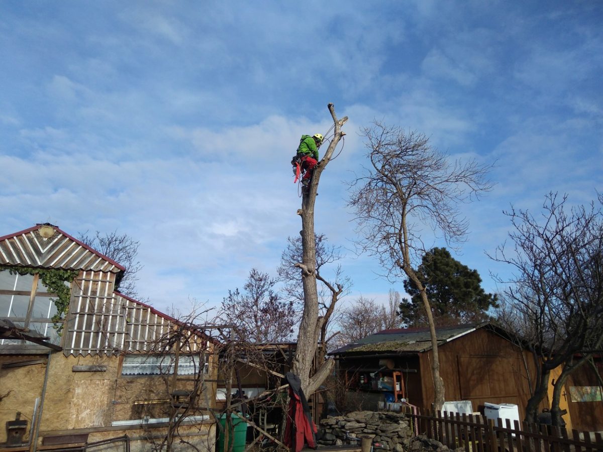 K pokácení dalšího ořešáku jsme byli pozváni do zahrádkářeké kolonie na pražském Balkáně. Místa pro kácení bylo opravdu málo. Z jedné strany chatka, z druhé plot, těsně u kmene vyvýšený záhon z vyskládaných kamenů. Jako zatím vždy se nám vše podařilo beze škod. Součástí zakázky byla i likvidace biomasy vzniklé kácením. Tu jsme odnosili do přistaveného kontejneru.