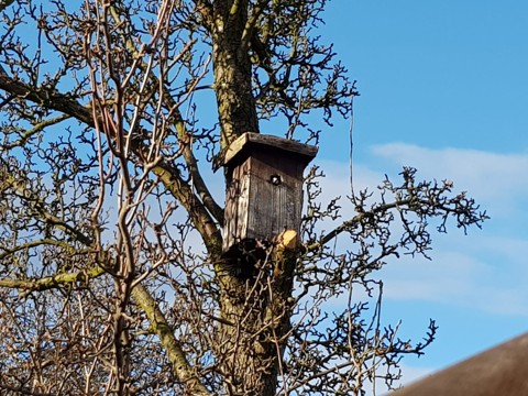 Na ořešáku byla umístěna ptačí budka, kterou jsme přestehovali na opodál stojící hrušeň a zanedlouho se v ní obevil nový nájemce 🙂