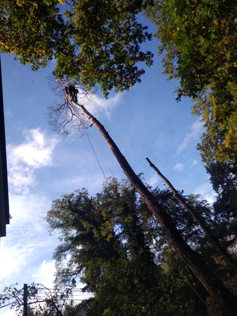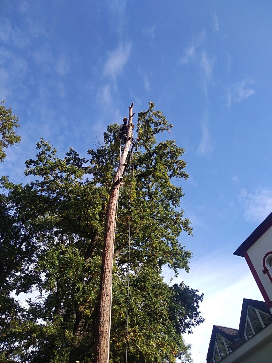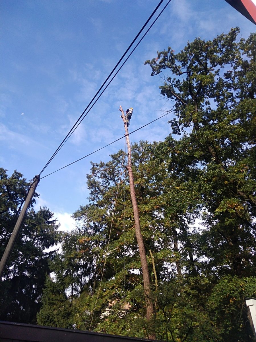 Jakje z výše uvedených fotek patrné, bylo nutno vylézt až do koruny stromu a celý strom postupně rozřezat od vrchu a opatrně spouštět na střechu garáže, odkud se již větve a špalky házeli na pozemek ústavu. Zajímá Vás, jak tyto práce probíhají? Více se dozvíte zde.