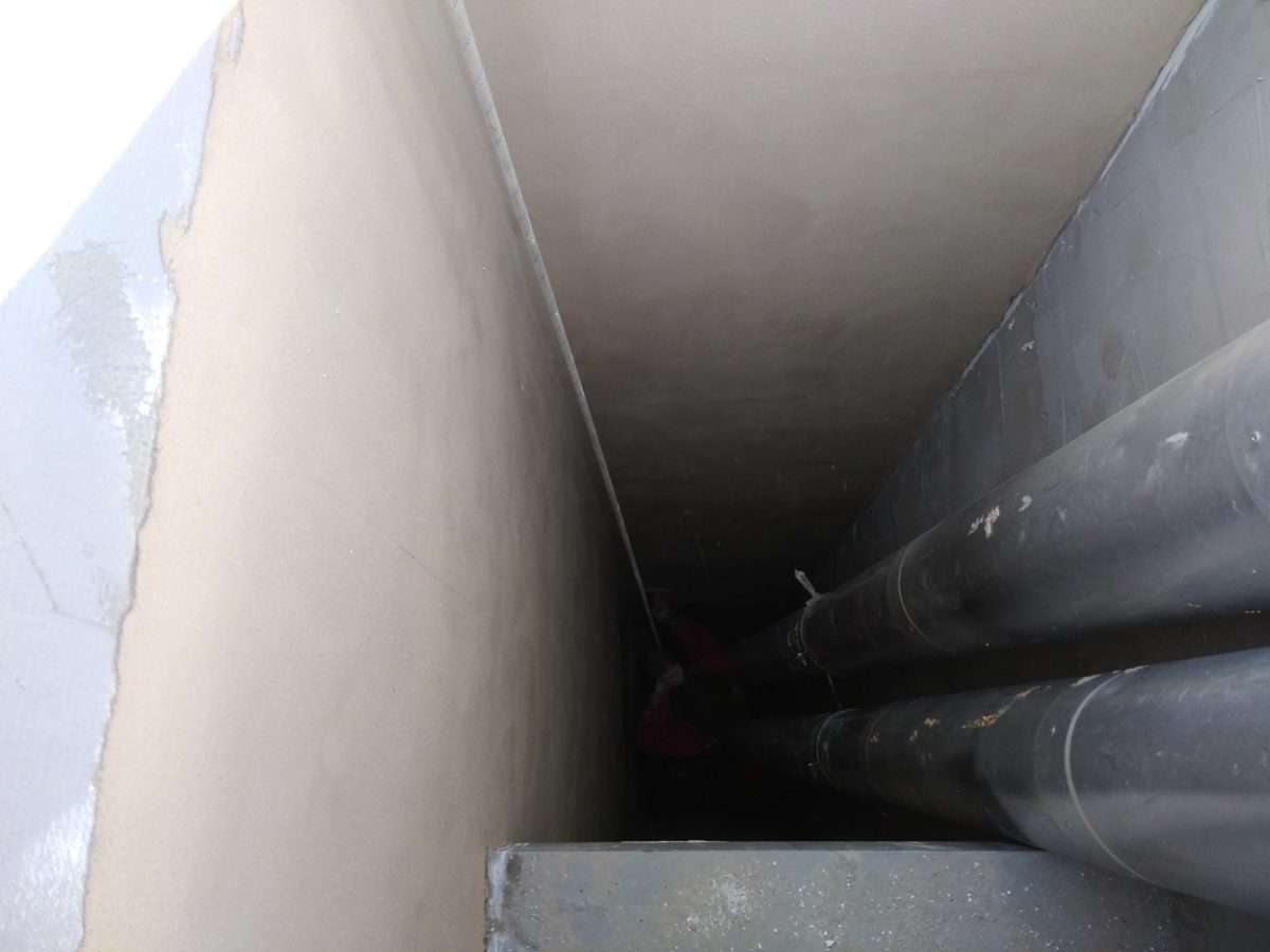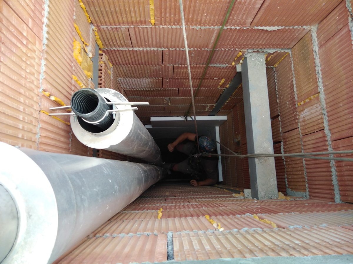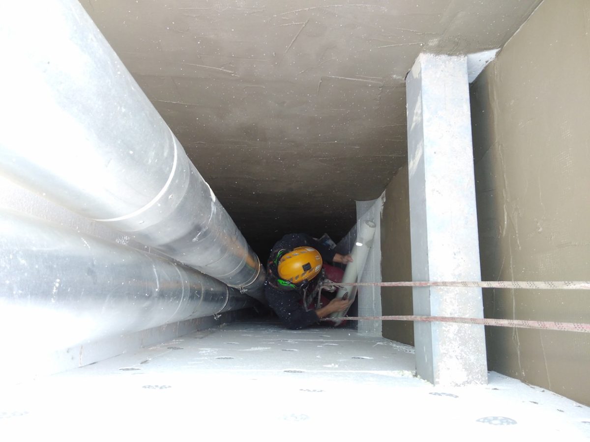 Vrámci dostavby nového patra na bytovém domě v Karlíně jsme dostali za úkol zateplit nově vzniklou část světlíku. Prostoru nebylo mnoho a pohyb ve světlíku byl ještě omezen vzduchotechnikou. Všechny práce probíhaly pomocí horolezecké techniky. Nejprve jsme oklepali vyčnívající kusy malty a poté již následoval klasický průběh prací. Lepení polystyrenových desek, kotvení a nanesení vrstev lepidla s perlinkou. Na závěr byl celý světlík ještě vyštukován a natřen fasádní barvou.